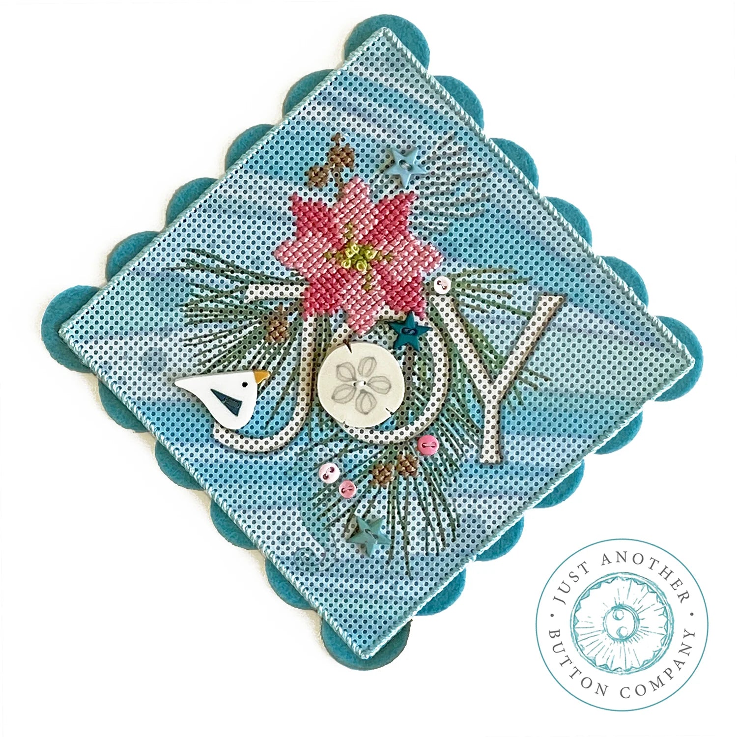 This "Beachy Christmas Joy" perforated paper kit is a quick stitch with a unique twist. JOY and a pine swag are pre-printed on a ocean wave paper background. You stitch the poinsettia and pine cones on the 18ct paper. Finish in a frame or follow our instructions to mount as an ornament.